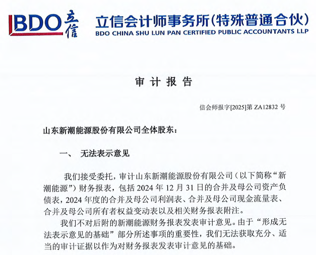 值得關(guān)注的是,因未能按時披露定期報(bào)告,*ST新潮股票自5月6日起停牌,并引發(fā)證監(jiān)會立案調(diào)查。在經(jīng)歷數(shù)月的加急審計(jì)后,立信會計(jì)師事務(wù)所7月5日完成了ST新潮2024年年報(bào)及2025年一季報(bào)的審計(jì)。然而,立信對財(cái)務(wù)報(bào)告和內(nèi)部控制均出具了“無法表示意見”的審計(jì)結(jié)論。