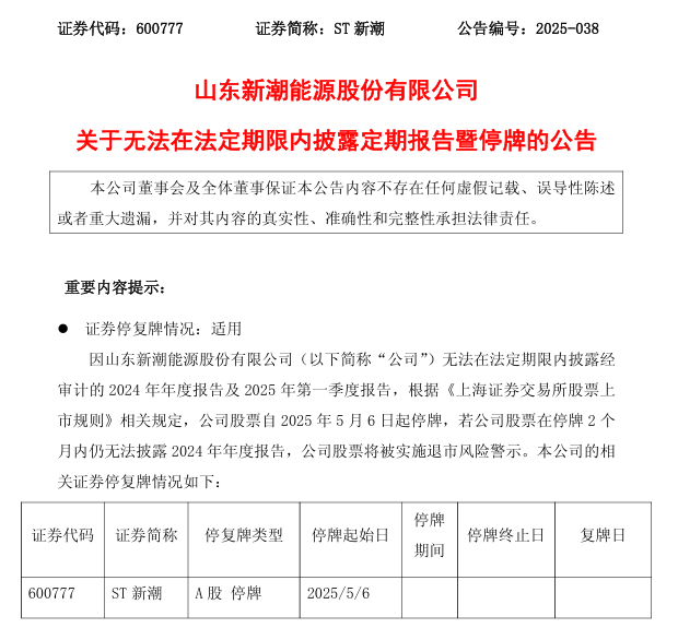 4月30日,公司披露關(guān)于無法在法定期限內(nèi)披露定期報(bào)告暨停牌的公告。按照相關(guān)規(guī)定,公司在股票停牌后兩個月內(nèi)仍未披露2024年年度報(bào)告的,將被實(shí)施退市風(fēng)險警示;如公司股票交易被實(shí)施退市風(fēng)險警示之日起兩個月內(nèi)仍未披露過半數(shù)董事保證真實(shí)性、準(zhǔn)確性和完整性的2024年年度報(bào)告,公司股票將被終止上市。