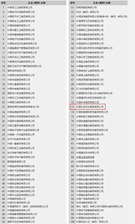 此外,中國(guó)經(jīng)濟(jì)網(wǎng)記者查詢到,目前國(guó)務(wù)院國(guó)資委網(wǎng)站的央企名錄已經(jīng)完成更新,其中,中國(guó)長(zhǎng)安汽車(chē)集團(tuán)已正式入列,序號(hào)為73位,這也是繼新增的中國(guó)雅江集團(tuán)之后,由國(guó)務(wù)院國(guó)資委直接管理的第100家央企。