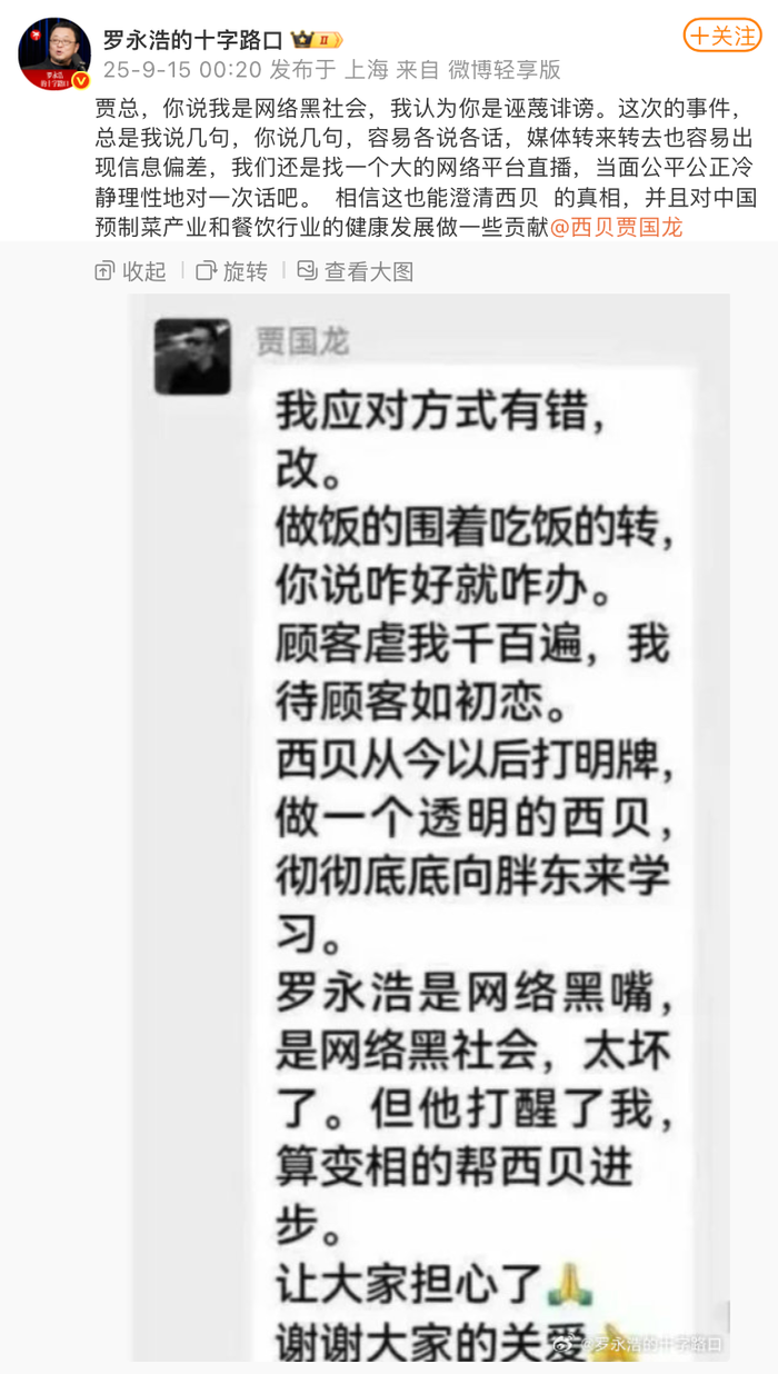 近日,西貝餐飲與羅永浩就預(yù)制菜引發(fā)的爭論在網(wǎng)絡(luò)上持續(xù)發(fā)酵。14日晚間,西貝創(chuàng)始人賈國龍此前表態(tài)的完整截圖流出,其中除了提到西貝從今以后要打明牌、向胖東來學習外,還將羅永浩稱為網(wǎng)絡(luò)黑嘴、網(wǎng)絡(luò)黑社會。對此,羅永浩今日凌晨在社交平臺表示,本次事件中雙方總是各說各話,媒體轉(zhuǎn)來轉(zhuǎn)去也容易出現(xiàn)信息偏差。他提議,雙方找一個大型網(wǎng)絡(luò)平臺直播,當面對話。