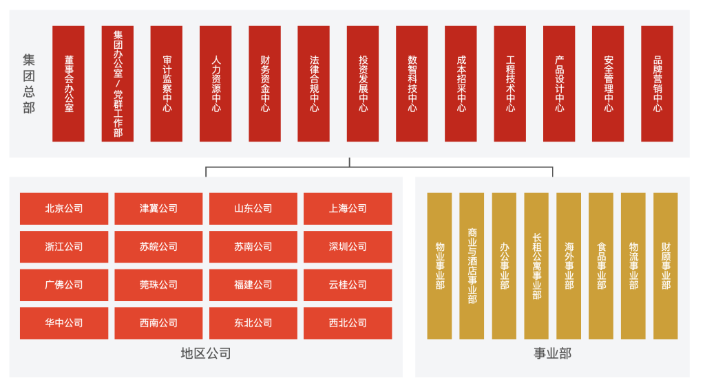 根據(jù)最新的組織架構(gòu),萬科集團總部除了董事會辦公室、集團辦公室/黨群工作部外,還設(shè)有投資發(fā)展中心、成本招采中心、工程技術(shù)中心、產(chǎn)品設(shè)計中心等11個中心;地區(qū)公司分為北京公司、津冀公司、山東公司、上海公司等16個公司;原物業(yè)事業(yè)集團(BG)等統(tǒng)一歸為事業(yè)部,目前包含物業(yè)、商業(yè)與酒店、辦公、長租公寓、物流等八大多元化業(yè)務(wù)。