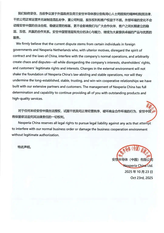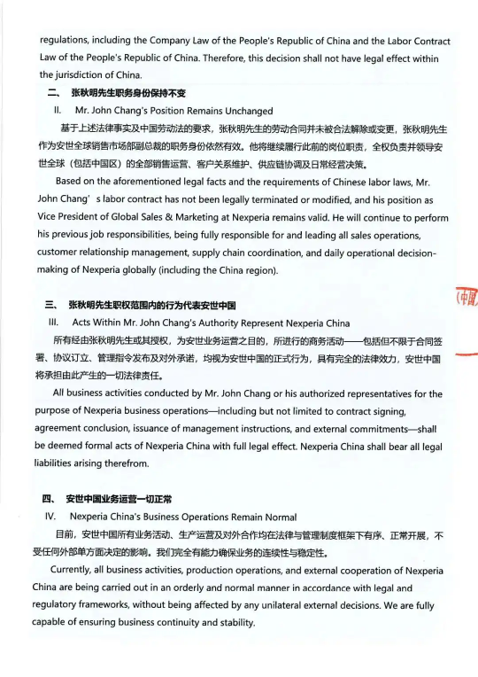 10月23日,安世半導(dǎo)體中國(guó)有限公司發(fā)布聲明稱(chēng),近期荷蘭總部單方面免去張秋明銷(xiāo)售市場(chǎng)部副總裁職務(wù)的決定,在中國(guó)法域下不發(fā)生法律效力。