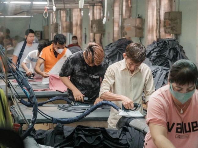 當(dāng)?shù)貢r(shí)間2025年4月10日,越南胡志明市,工人在位于平順省的泰松服裝廠熨燙衣物。CFP