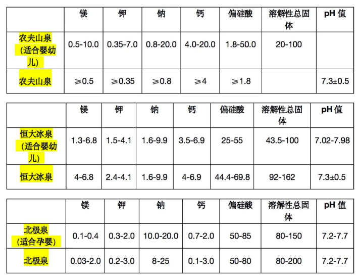 結(jié)果發(fā)現(xiàn),兩者的成分含量并沒有顯著的區(qū)別。如農(nóng)夫山泉(適合嬰幼兒)標(biāo)注鎂含量為0.5-10.0,鉀含量為0.35—7.0,鈉含量為0.8—20.0,鈣含量為4.0—20.0,偏硅酸為1.8—50.0;而農(nóng)夫山泉普通飲用水標(biāo)注鎂含量為≥0.5,鉀含量為≥0.35,鈉含量為≥0.8,鈣含量為≥4,偏硅酸為≥1.8。