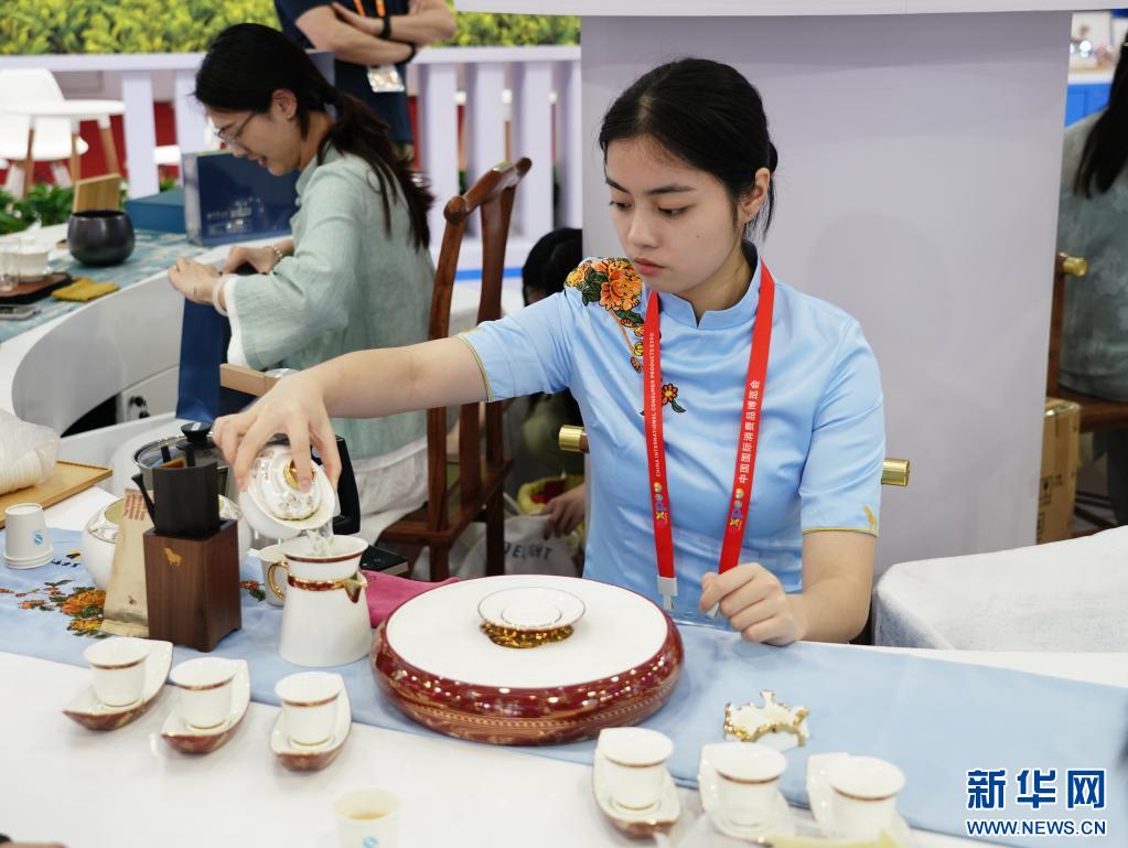 4月10日,消博會(huì)福建展臺(tái)的工作人員在為參觀者沏茶。當(dāng)日,第三屆中國(guó)國(guó)際消費(fèi)品博覽會(huì)在海南??陂_(kāi)幕。本屆消博會(huì)以“共享開(kāi)放機(jī)遇、共創(chuàng)美好生活”為主題,將助力消費(fèi)恢復(fù)和升級(jí),為各國(guó)企業(yè)共享中國(guó)市場(chǎng)提供機(jī)遇。新華社記者 樊雨晴 攝
