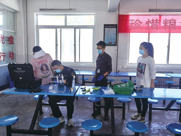 圖為華亭市策底鎮(zhèn)市場監(jiān)管部門執(zhí)法人員在轄區(qū)一所學(xué)校餐廳對抽樣的食材進行現(xiàn)場快檢。于紅霞 史安良 文/攝