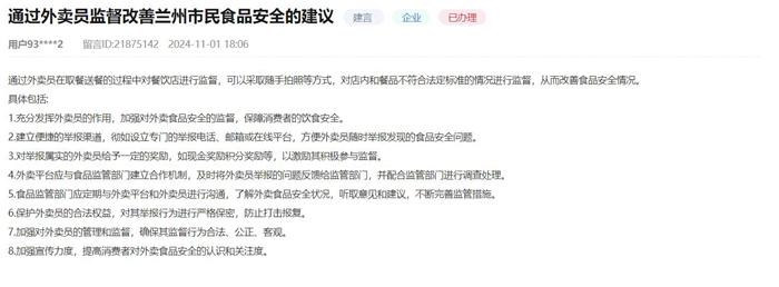 該網(wǎng)友建議建立便捷的舉報渠道,如設(shè)立專門的舉報電話、郵箱或在線平臺,方便外賣員隨時舉報發(fā)現(xiàn)的食品安全問題;對舉報屬實(shí)的外賣員給予一定的獎勵,如現(xiàn)金獎勵、積分獎勵等,以激勵其積極參與監(jiān)督;食品監(jiān)管部門應(yīng)定期與外賣平臺和外賣員進(jìn)行溝通,了解外賣食品安全狀況,聽取意見和建議,不斷完善監(jiān)管措施;保護(hù)外賣員的合法權(quán)益,對其舉報行為進(jìn)行嚴(yán)格保密,防止打擊報復(fù);加強(qiáng)對外賣員的管理和監(jiān)督,確保其監(jiān)督行為合法、公正、客觀;加強(qiáng)宣傳力度,提高消費(fèi)者對外賣食品安全的認(rèn)識和關(guān)注度。