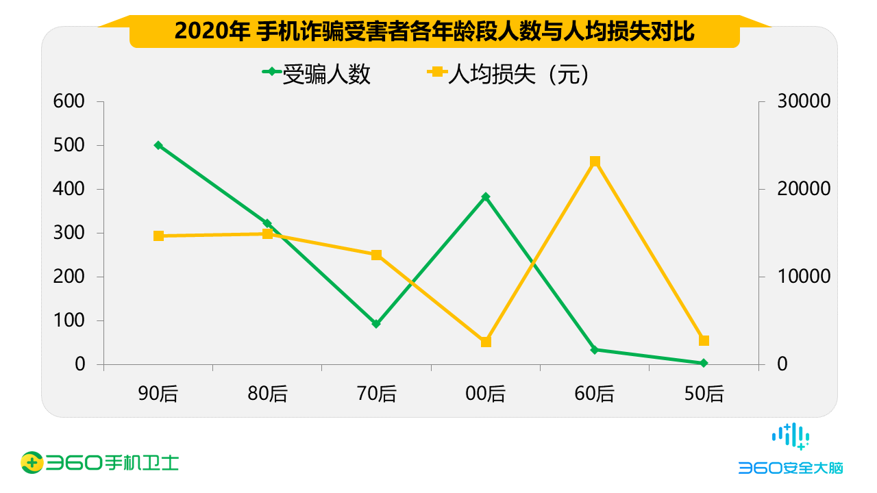 然而,90后雖然受騙人數(shù)較多,但人均損失較低。60后一旦落入網(wǎng)絡騙局,則會損失慘重,人均損失超過兩萬元。