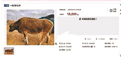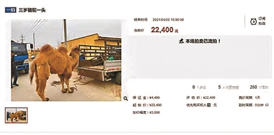 今年4月19日12時(shí),新疆維吾爾自治區(qū)木壘哈薩克自治縣人民法院在阿里拍賣平臺(tái)上對(duì)一頭3歲的駱駝和一頭5歲的土牛進(jìn)行拍賣。駱駝的起拍價(jià)格為22400元,土牛的起拍價(jià)格為18000元。截至2021年4月20日12時(shí),兩只活物標(biāo)的物最終流拍。