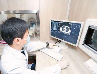 “肺癌早篩車”配備車載低劑量CT機、智能AI輔助讀片和5G技術(shù),讓被篩者可在車上接受CT檢查。圖為浙江省紹興市中心醫(yī)院醫(yī)共體總院放射、胸外、呼吸、腫瘤等科室專家來到安昌分院,為當?shù)鼐用耖_展肺癌篩查。 |