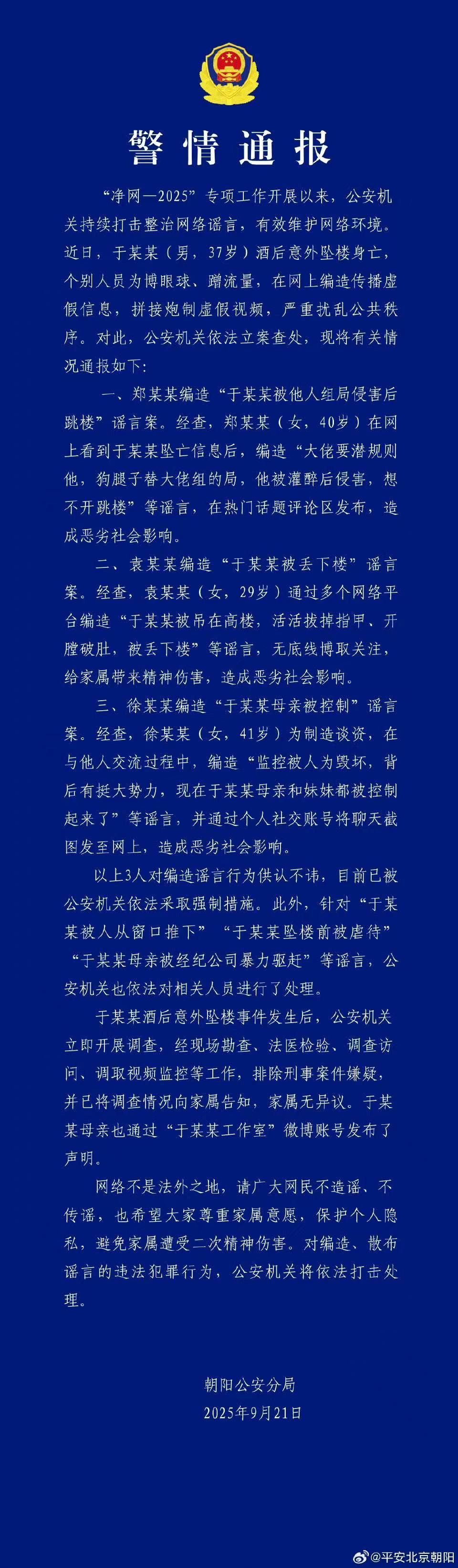 北京警方:演員于某某墜亡,三人散布謠言被采取強制措施