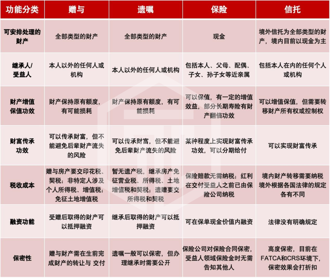 以上即為幾種常用財富傳承工具的對比與分析,我們可以結(jié)合自身情況進行傳承規(guī)劃的安排。