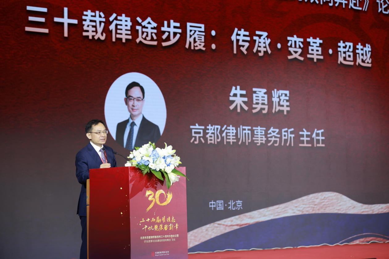 京都律師事務所主任朱勇輝在致辭中表示,在京都所三十歲生日這個特別的日子里,與會人員共同關(guān)注中國律師的成長,共同關(guān)心中國律師行業(yè)的發(fā)展,共同關(guān)切中國法治的進步。希望在探討中國律所四十載旅途步履,聚焦中國律師行業(yè)變革的同時,能夠總結(jié)中國律所發(fā)展的經(jīng)驗與路徑,讓律師為國家法治建設(shè)作出更大貢獻。