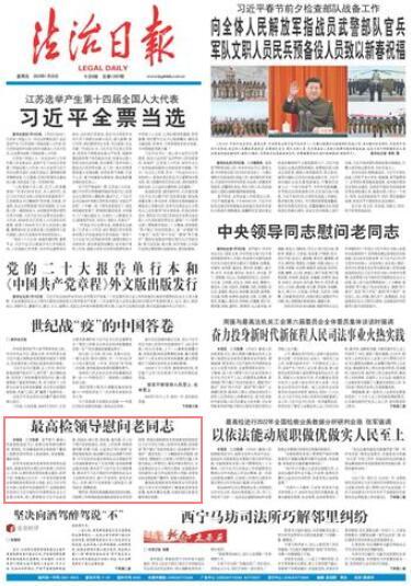 本報訊 記者張昊 春節(jié)前夕,最高人民檢察院黨組書記、檢察長張軍慰問韓杼濱、賈春旺,代表最高檢和全體檢察干警衷心祝愿老領導和家人新春愉快、身體健康、闔家幸福。