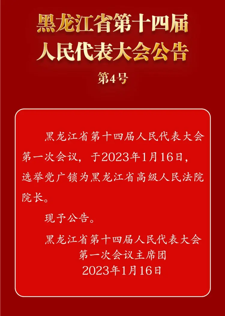 1月16日,黑龍江省第十四屆人民代表大會(huì)第一次會(huì)議選舉黨廣鎖為黑龍江省高級(jí)人民法院院長(zhǎng)。