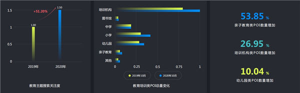 2020年雄安新區(qū)服務(wù)業(yè)相關(guān)需求出現(xiàn)了較大的增長。其中,維修、物流等相關(guān)搜索詞的用戶搜索量分別增長了78.74%和18.09%,而這兩類POI的數(shù)量相較于2019年同期也分別增長了28.49%和7.8%;親子教育類POI、培訓機構(gòu)類POI和幼兒園POI增量分別為53.85%、26.95%和10.04%;醫(yī)療和汽車服務(wù)類POI數(shù)量的增長比例均達到30%;美食類POI數(shù)量同比增長24.7%,;購物類POI數(shù)量同比增長13.7%;