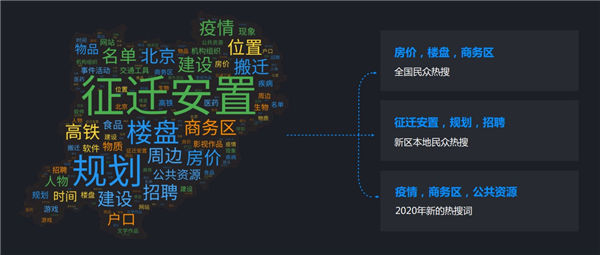 《報告》顯示,房價、規(guī)劃、建設(shè)、招聘和高鐵是過去兩年全國民眾對雄安的持續(xù)關(guān)注熱點。與2019年相比,“商務(wù)區(qū)”首次進入全國熱門搜索詞,這反映出越來越多的人開始考慮到雄安新區(qū)開展相關(guān)商業(yè)活動的可能。雄安新區(qū)本地民眾的關(guān)注重點,則保持了相對穩(wěn)定,“搬遷”和“規(guī)劃”等主題詞近兩年持續(xù)受到關(guān)注。此外,“疫情”和“公共資源”等新的熱點詞開始受到雄安新區(qū)本地民眾的關(guān)注,體現(xiàn)了雄安新區(qū)當前建設(shè)階段新的特點。