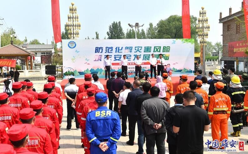 在全國(guó)防災(zāi)減災(zāi)日宣傳活動(dòng)現(xiàn)場(chǎng),戴泊生向安新小學(xué)頒發(fā)省級(jí)地震科普教育示范學(xué)校牌匾,劉樹(shù)軍向東淀頭村頒發(fā)全國(guó)綜合減災(zāi)示范社區(qū)牌匾,兩位領(lǐng)導(dǎo)共同向雄州救援隊(duì)、雄風(fēng)救援隊(duì)、藍(lán)天救援隊(duì)、美團(tuán)代表隊(duì)等新區(qū)安全宣傳志愿者隊(duì)伍代表授旗。中國(guó)人民財(cái)產(chǎn)保險(xiǎn)股份有限公司雄安分公司籌建負(fù)責(zé)人張友林為活動(dòng)致開(kāi)幕詞,中國(guó)福利基金會(huì)支持雄安公益基金執(zhí)行主任、北京支持雄安產(chǎn)業(yè)發(fā)展促進(jìn)會(huì)常務(wù)副會(huì)長(zhǎng)兼秘書(shū)長(zhǎng)彌雪向雄安新區(qū)捐贈(zèng)了高空細(xì)水霧滅火消防車(chē)。