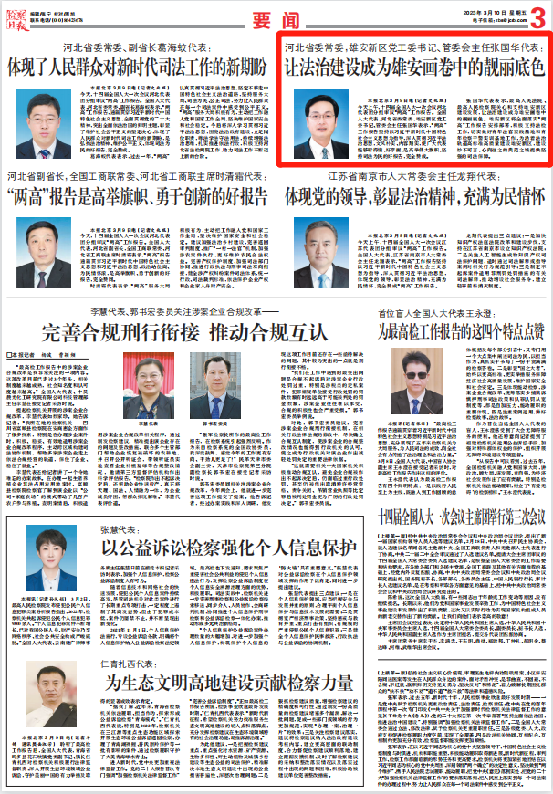 3月10日出版的《檢察日?qǐng)?bào)》刊發(fā)了題為《河北省委常委,雄安新區(qū)黨工委書記、管委會(huì)主任張國(guó)華代表: 讓法治建設(shè)成為雄安畫卷中的靚麗底色 》的報(bào)道,一起來看↓↓↓