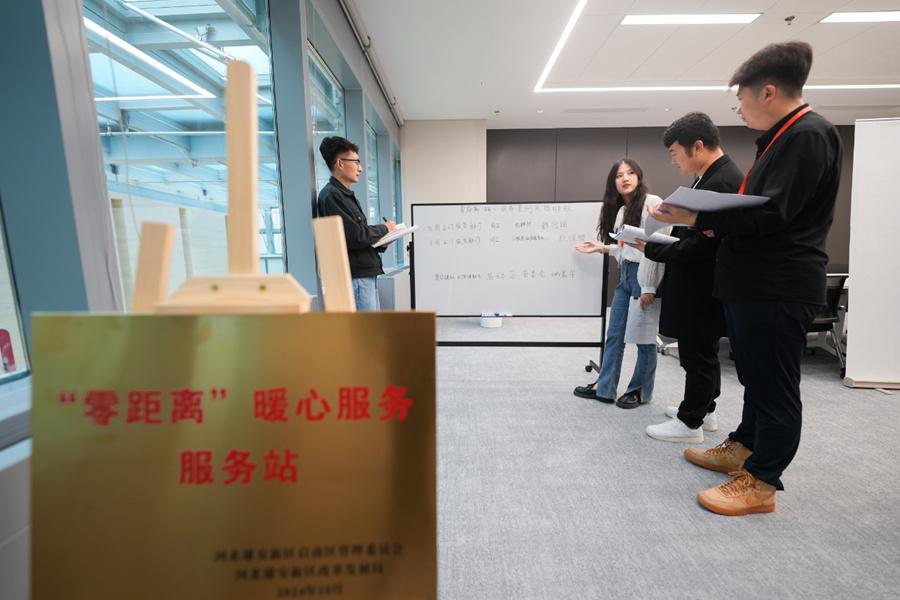 雄安新區(qū)工作人員正在中國星網(wǎng)辦公樓里安排“零距離”暖心服務(wù)星網(wǎng)排班事宜。河北日?qǐng)?bào)記者李暢 攝