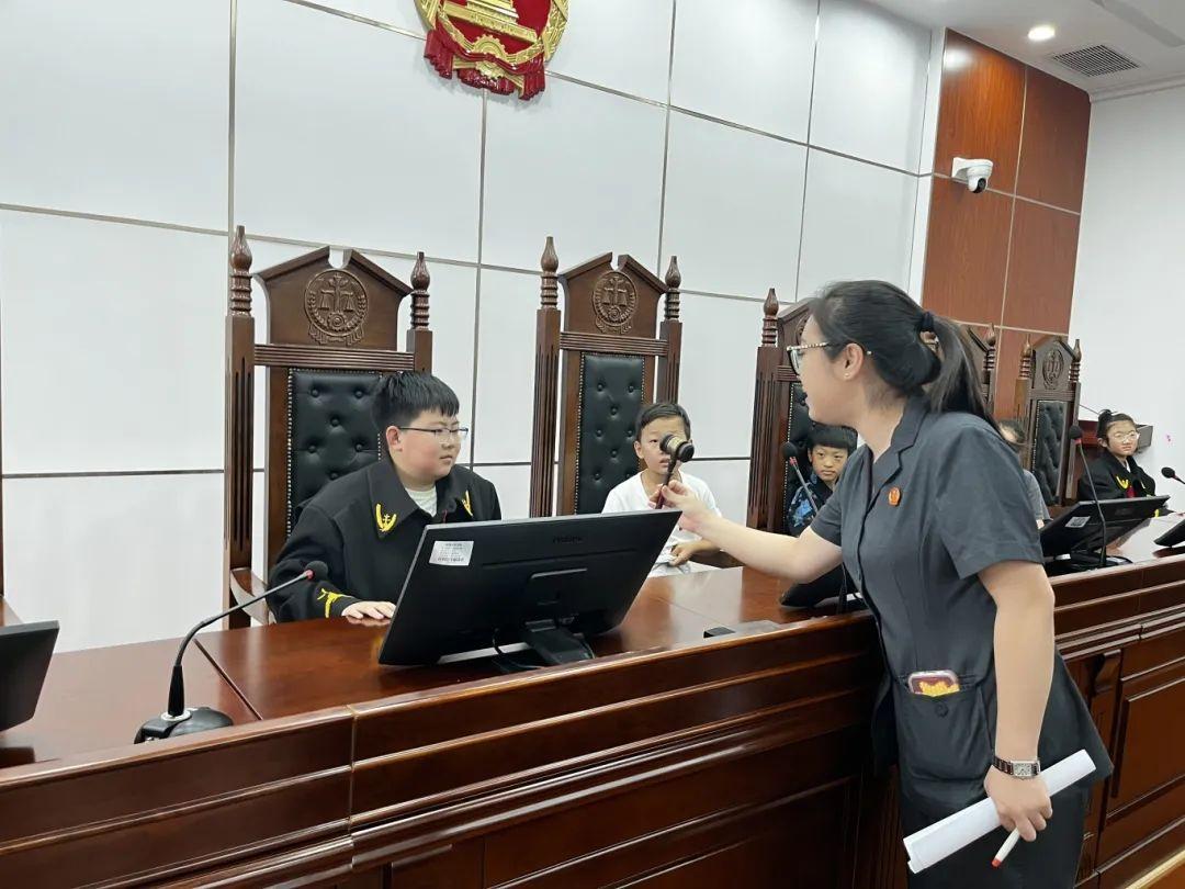審判庭是此次參觀的“重頭戲”。推開審判庭厚重的大門,審判席、原告席、被告席整齊排列,莊嚴(yán)的氛圍讓孩子們瞬間安靜下來,在工作人員的邀請(qǐng)下,孩子們輪流坐上審判席,感受法袍的重量與審判席的莊嚴(yán),他們輕輕敲擊法槌,體驗(yàn)“小法官”的感覺?!扒梅ㄩ硶r(shí)要嚴(yán)肅,因?yàn)檫@代表著公正裁判”工作人員為其科普法槌的意義,孩子們似懂非懂地點(diǎn)頭,小臉上寫滿了認(rèn)真。