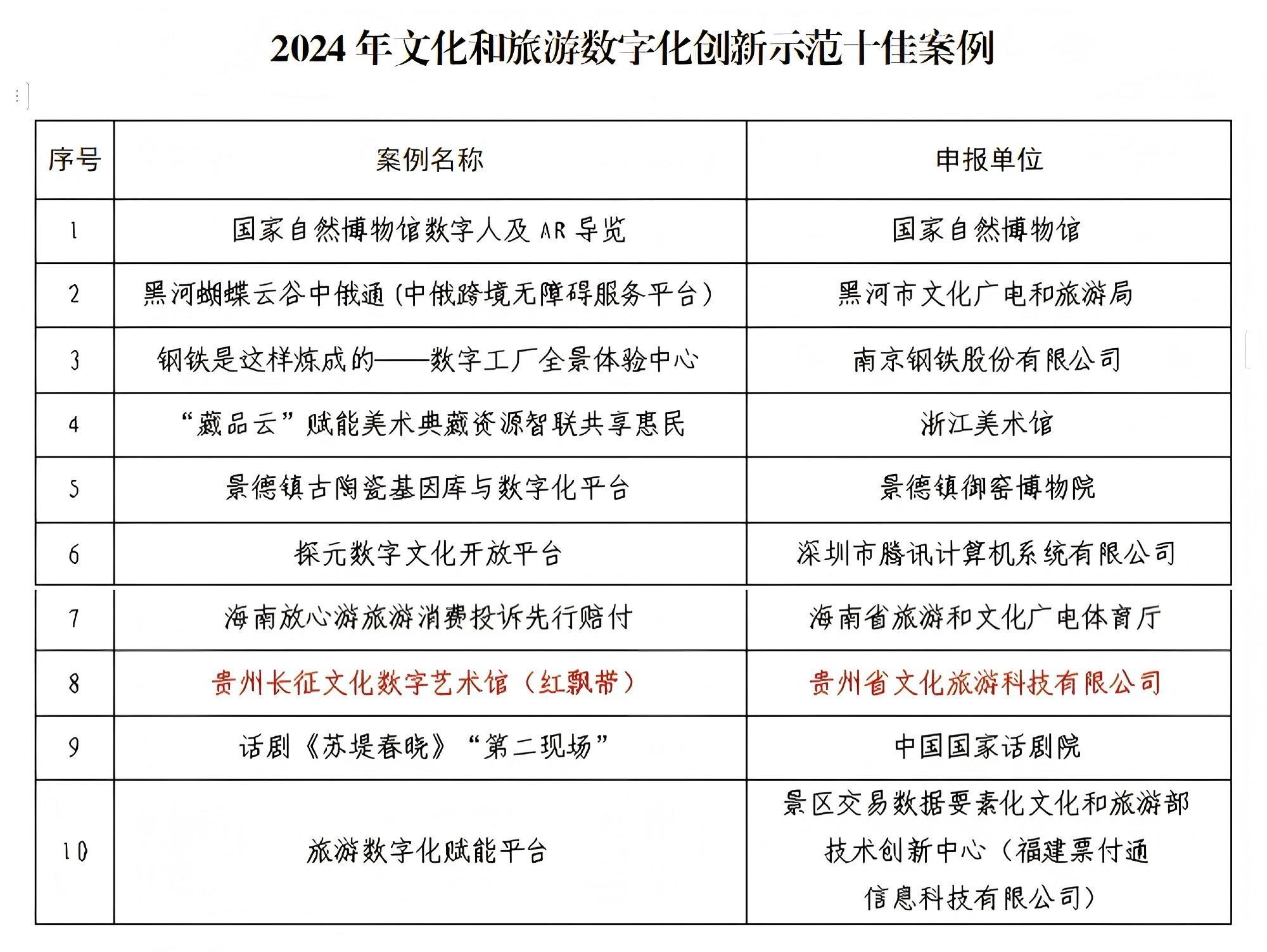 近日,文化和旅游部公布了2024年文化和旅游數(shù)字化創(chuàng)新示范十佳案例,集中示范推廣文化和旅游領(lǐng)域數(shù)字化創(chuàng)新的最新成果?!百F州長征文化數(shù)字藝術(shù)館(紅飄帶)”入選2024年文化和旅游數(shù)字化創(chuàng)新示范十佳案例。