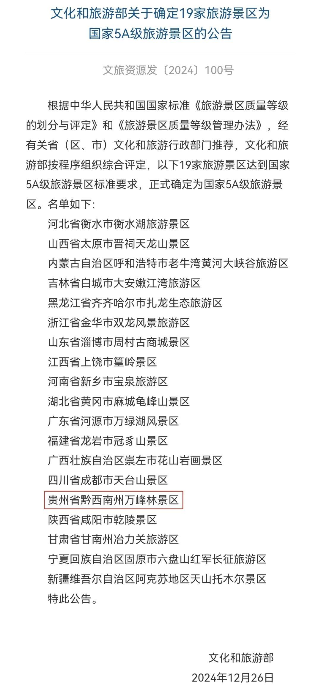 近日,文化和旅游部網(wǎng)站發(fā)布公告,確定19家旅游景區(qū)為國家5A級旅游景區(qū),其中,貴州省黔西南州萬峰林景區(qū)成功入選,成為貴州省第10個國家5A級旅游景區(qū)。