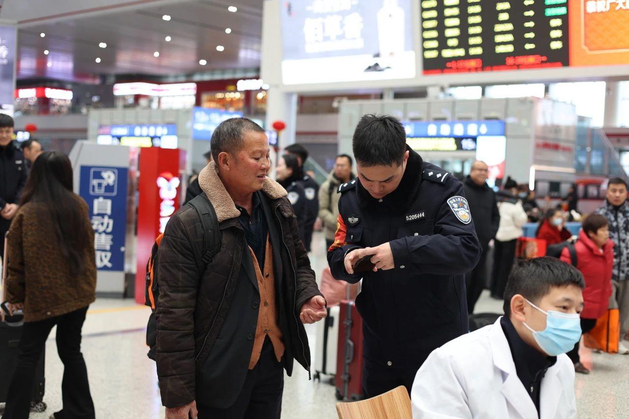 “注意腳下,請(qǐng)往這邊走。”“您好,您的檢票口在前面右轉(zhuǎn)?!薄拔襾?lái)幫您提行李吧!”在貴陽(yáng)北站候車室內(nèi),戴著紅袖套的志愿者民警們?yōu)槁每吞峁┳稍冎敢?、搬運(yùn)行李、電子取票等溫馨服務(wù),用這一抹紅色點(diǎn)綴春運(yùn),用實(shí)際行動(dòng)溫暖寒冬。