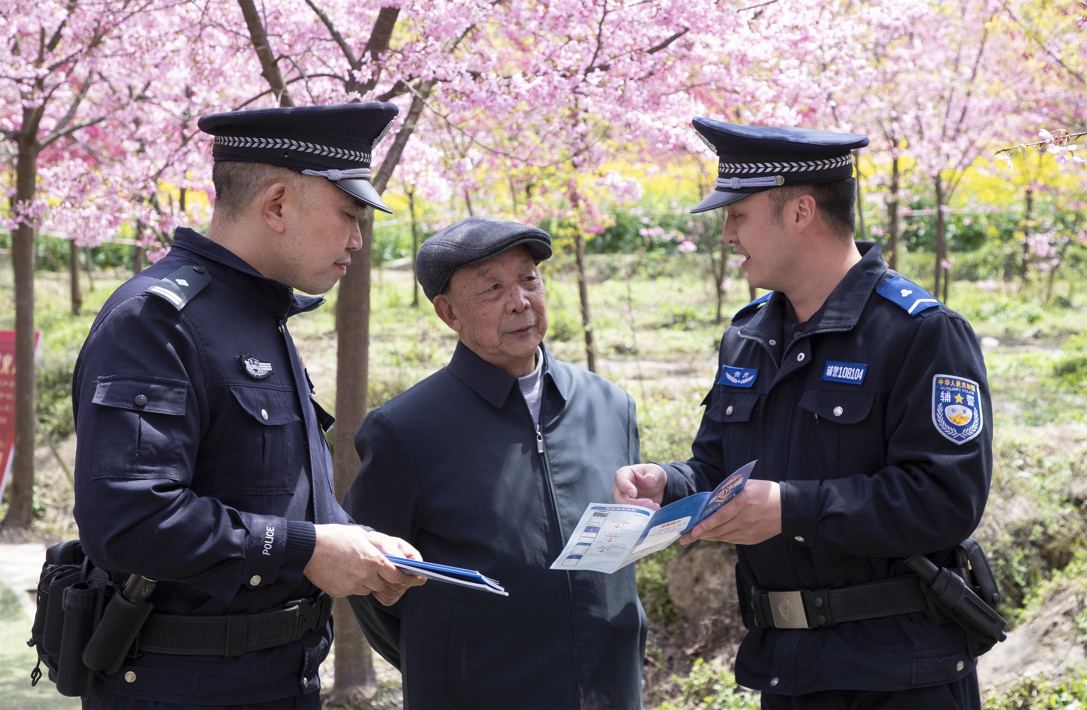 景美入眼簾,警心佑君安?!鞍⒁蹋催@櫻花多美,但也要小心腳下,別光顧著拍照忘了安全?!痹趶澢泥l(xiāng)間小道上,巡邏民警不斷提醒過(guò)往游客注意安全。