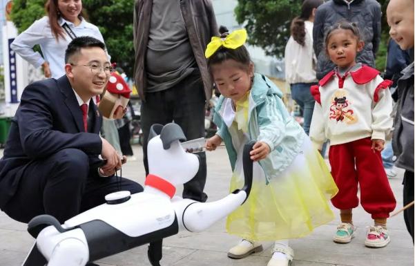 活動(dòng)現(xiàn)場(chǎng),一位特殊的“普法宣傳員”——智能普法機(jī)器狗“小白”閃亮登場(chǎng),瞬間成為全場(chǎng)焦點(diǎn)。這只靈活可愛的機(jī)器狗不僅能自如行走、做出俏皮動(dòng)作,更能通過(guò)內(nèi)置的普法知識(shí)庫(kù),用孩子們喜聞樂(lè)見的語(yǔ)言和方式,生動(dòng)講解《中華人民共和國(guó)未成年人保護(hù)法》中的“家庭保護(hù)”“學(xué)校保護(hù)”“社會(huì)保護(hù)”以及民法典中關(guān)于未成年人權(quán)益保障的相關(guān)條款。它機(jī)智的回答、萌萌的互動(dòng),引得小朋友們紛紛圍觀、踴躍提問(wèn),在歡聲笑語(yǔ)中將法治的種子悄然播撒心田。