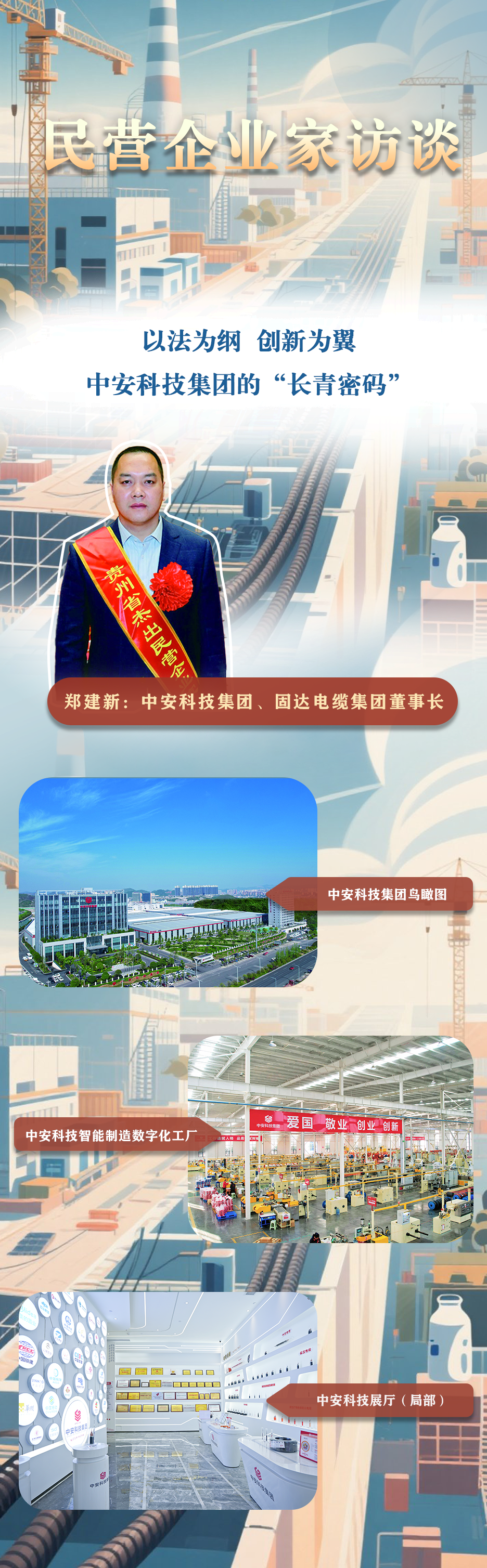 從國家政策的頂層設(shè)計,到民營經(jīng)濟促進法的正式施行,法治為民營經(jīng)濟發(fā)展提供了堅實的制度保障。在此背景下,中安科技集團憑借其硬核實力,有力彰顯了企業(yè)的強勁發(fā)展態(tài)勢。本期民營企業(yè)家訪談,法治網(wǎng)·法治黔行記者對話中安科技集團、固達電纜集團董事長鄭建新,一同探討法治與科技型企業(yè)發(fā)展的融合之道。