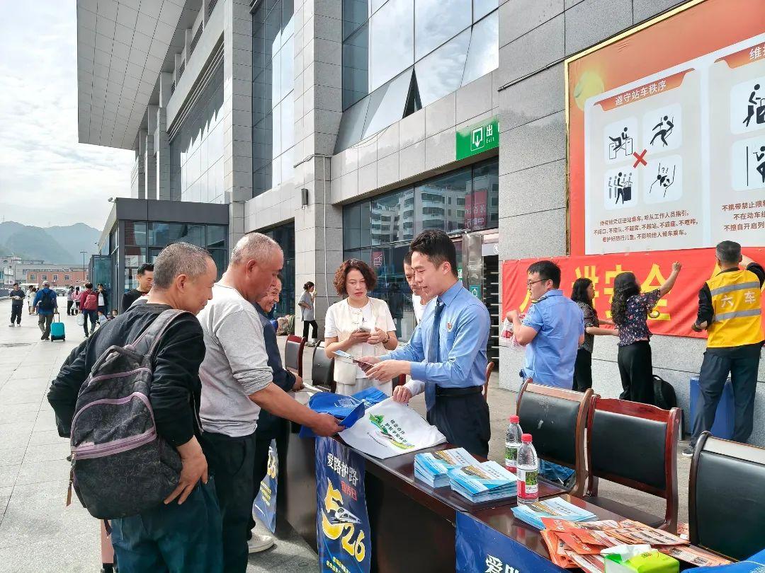 據了解,宣傳現(xiàn)場不僅發(fā)放各類法律法規(guī)宣傳資料,還通過音響語音播放鐵路法律法規(guī)及相關安全知識,組織群眾參與現(xiàn)場互動。六盤水市人民檢察院、六盤水工電段、六盤水車務段、六盤水鐵路派出所等單位向來往群眾講解了有關鐵路安全的法律法規(guī)。