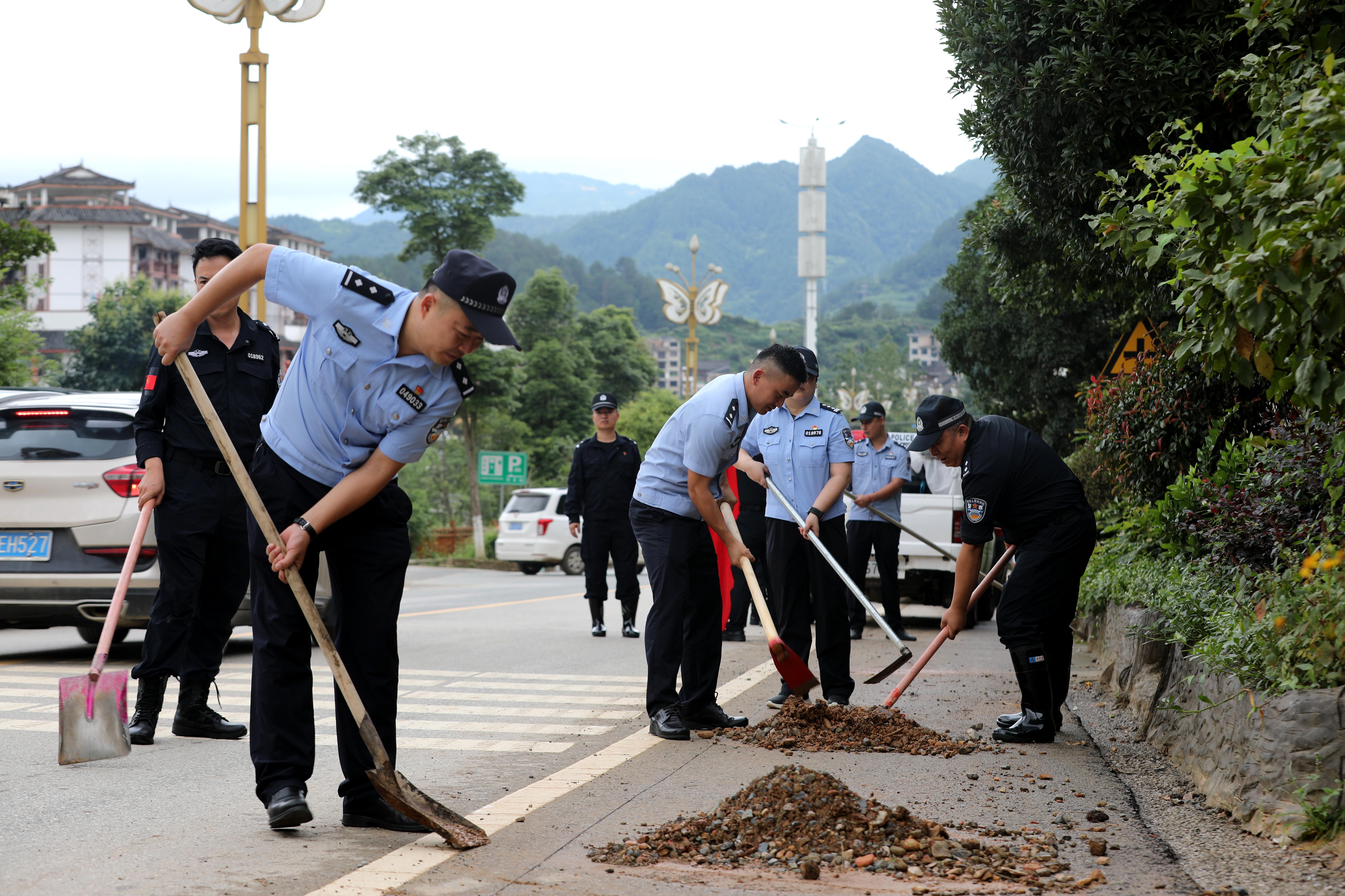黨旗所指,干警所向。近50名佩戴黨徽的政法干警在丹江鎮(zhèn)、永樂(lè)鎮(zhèn)受災(zāi)兩地,他們手持鐵鍬掃帚、高壓水槍全力清淤排障,深入街巷民房,幫助群眾轉(zhuǎn)移物資,恢復(fù)群眾正常生產(chǎn)生活秩序。