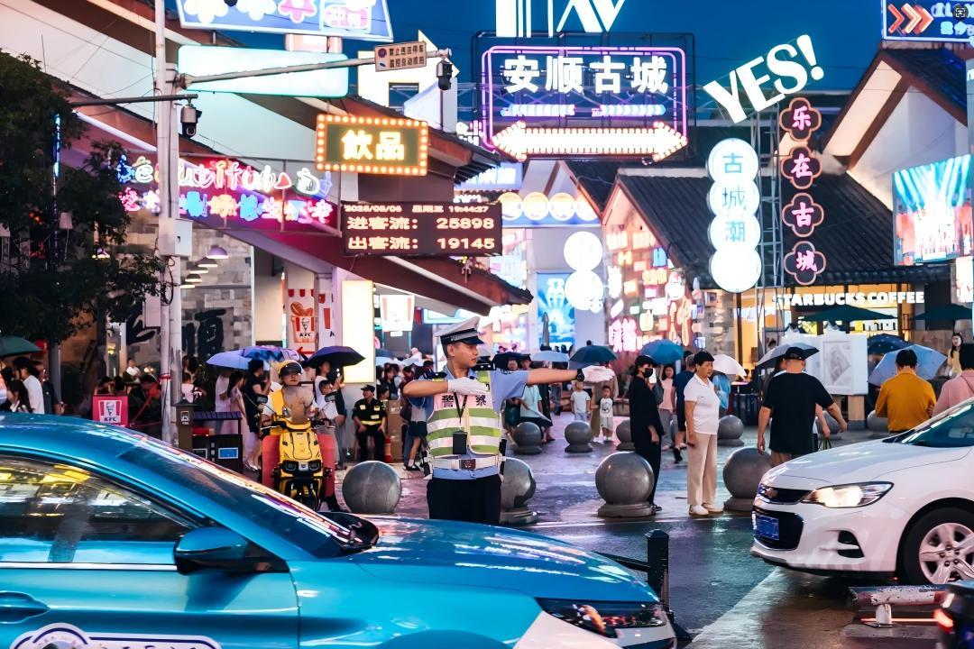 如果說景區(qū)交通管理是安順交警的常規(guī)動作,那么中心城區(qū)面臨的挑戰(zhàn)則是全新的“考題”。隨著“21℃的城市·360度的人生”城市IP品牌的打響,以安順古城、虹山湖休閑生活區(qū)為首的城區(qū)景點和大街小巷遍布的特色小吃,讓許多游客從“過境游”向“深度游”、從“景點打卡”向“避暑度假”轉變,許多游客整個暑期都在安順度過,感受迷人風光、深厚底蘊與夏日清涼的獨特魅力。今年7月起,安順古城單日平均接待游客10萬人次,最高峰達到18萬人次,這展示了安順一流旅游城市建設的成果,但是在道路資源變化不大的情況下,群眾日常出行疊加游客自駕出行需求,讓城市交通流量大幅增加,給道路交通管理帶來了極大挑戰(zhàn)。