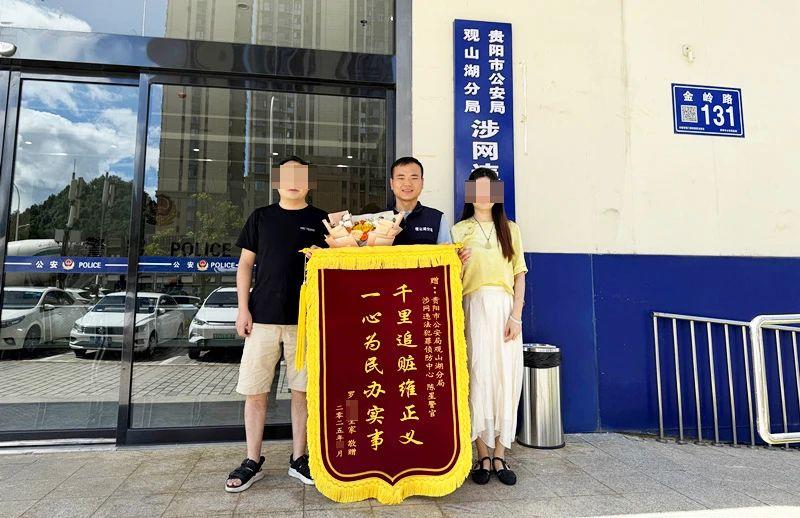 近日,群眾羅先生將一面印著“千里追贓維正義 一心為民辦實事”字樣的錦旗送到了貴州省貴陽市公安局觀山湖分局涉網(wǎng)違法犯罪偵防中心,感謝反詐民輔警幫其挽回被騙損失。