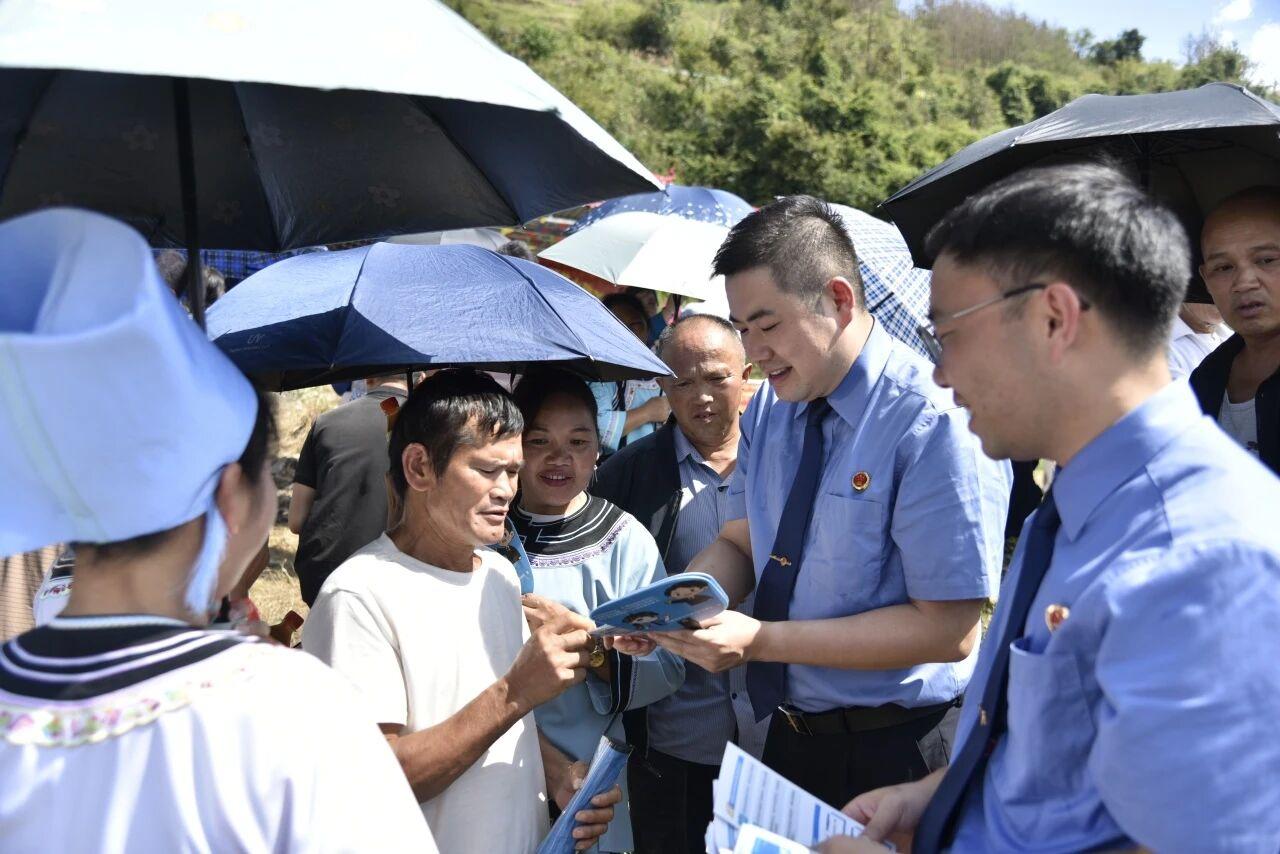 10月9日,正值水族傳統(tǒng)節(jié)日端節(jié)之際,貴州省黔南州三都縣周覃鎮(zhèn)的新各端坡上彩旗飄揚(yáng),身著水族服飾的群眾陸續(xù)聚集,準(zhǔn)備參加傳統(tǒng)的賽馬盛會。三都縣檢察院的“雙語普法小分隊”帶著法律手冊、宣傳折扇來到現(xiàn)場,為這場民俗盛宴增添了濃郁的法治氣息。