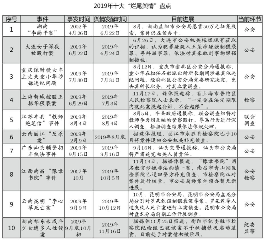編者按:今年的網絡輿論場并不平靜,多起涉政法事件引爆輿論場,并發(fā)酵成為全網關注的熱點輿情,引發(fā)輿論震動。如備受輿論矚目的孫小果案、鄧世平案,從曝光之日起,就牽動著無數(shù)輿論目光。近日,相關涉案人員陸續(xù)受審獲刑,背后的“保護傘”也被立案調查。這類重大輿情事件不“爛尾”,體現(xiàn)出各級政法機關依法履行職責的自覺和擔當,值得稱道。然而也需看到,2019年接近尾聲,仍有不少輿情事件沒有掃尾,輿論場還遺留大量問號等待拉直。近年來,政法網絡輿情回應率穩(wěn)步提升的前提下,輿情事件的處置完結率卻忽高忽低,2019年上半年不到六成事件有最終結果,遠低于2018年全年75%的比率。鑒于此,法制網輿情中心(ID:fzwyqzx)盤點這一年的重大政法輿情事件,梳理出那些長時間沒有進展和結果的“爛尾輿情”,并通過分析其類型、總結其特征、剖析其危害,提出規(guī)避與應對的建議,以供有關部門參考借鑒。