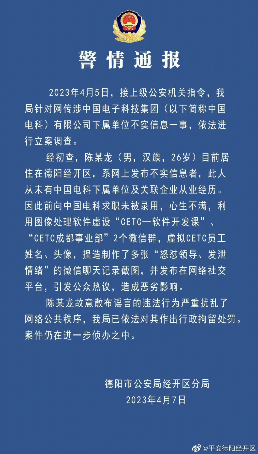 4月7日,大皖新聞報(bào)道稱(chēng),網(wǎng)傳加班事件當(dāng)事人陳志龍為四川省德陽(yáng)市經(jīng)開(kāi)區(qū)某科技公司員工,德陽(yáng)市人社局辦公室也回應(yīng)稱(chēng)“正在進(jìn)行調(diào)查”。4月7日晚間,四川省德陽(yáng)市公安局經(jīng)開(kāi)區(qū)分局通過(guò)官方微博發(fā)布警方通報(bào)稱(chēng),陳某龍從未有中國(guó)電科下屬單位及關(guān)聯(lián)企業(yè)從業(yè)經(jīng)歷,其因此前向中國(guó)電科求職未被錄用,心生不滿(mǎn),利用圖像處理軟件虛設(shè)“CETC—軟件開(kāi)發(fā)課”“CETC成都事業(yè)部”2個(gè)微信群,虛擬CETC員工姓名、頭像,捏造制作了多張“怒懟領(lǐng)導(dǎo)、發(fā)泄情緒”的微信聊天記錄截圖,并發(fā)布在網(wǎng)絡(luò)社交平臺(tái),造成惡劣影響。目前陳某龍已被警方行政拘留。4月8日,微博平臺(tái)官方表示,已清理此事件中散布不實(shí)信息、惡意攻擊國(guó)企體制的違規(guī)內(nèi)容5792條,并對(duì)“@老c隊(duì)長(zhǎng)”等9個(gè)違規(guī)“自媒體”賬號(hào)及253個(gè)違規(guī)用戶(hù)予以禁言處置。