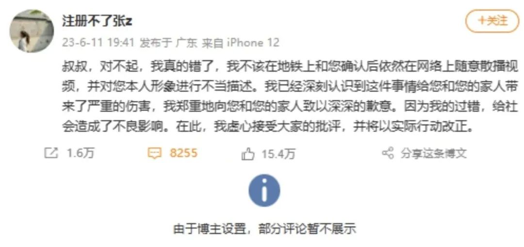 6月11日,被懷疑偷拍男子的兒子鄧某通過(guò)《南方都市報(bào)》發(fā)聲,稱父親是農(nóng)民工,當(dāng)天坐地鐵想在廣州轉(zhuǎn)轉(zhuǎn),未曾想到被當(dāng)做“猥瑣男”發(fā)到網(wǎng)上。他希望涉事女子公開(kāi)道歉,否則將選擇起訴。該表態(tài)獲得大量網(wǎng)民支持。當(dāng)日,鄧某陪同父親到廣州鷺江站派出所報(bào)警,張某致歉,雙方再次達(dá)成和解。鄧某表示,她還是一名學(xué)生,公開(kāi)道歉就好,不想影響她太多。當(dāng)日19時(shí)許,“@注冊(cè)不了張z”發(fā)博致歉,這條微博引發(fā)網(wǎng)民評(píng)論8000余條,但張某關(guān)閉了評(píng)論功能,僅顯示一條為其“站臺(tái)”的精選留言,很快有網(wǎng)民發(fā)現(xiàn)該賬號(hào)為張某小號(hào)。這一“操作”徹底激怒網(wǎng)民,有網(wǎng)民諷刺稱:“用專業(yè)優(yōu)勢(shì)帶風(fēng)向,發(fā)現(xiàn)‘失手’后先大號(hào)道歉,再小號(hào)帶節(jié)奏,不愧是傳媒學(xué)院的高材生?!比绯钡馁|(zhì)疑聲中,張某所在的四川大學(xué)也遭遇壓力,不斷有網(wǎng)民頻繁催促校方處置此事。6月12日,四川大學(xué)再次回應(yīng)稱仍在調(diào)查,但否認(rèn)網(wǎng)傳將要開(kāi)除涉事女生的信息,輿情熱度持續(xù)走高,并于6月14日觸頂。
