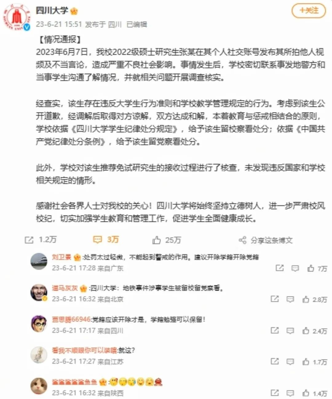 歷經(jīng)較長(zhǎng)的沉淀期后,6月21日,四川大學(xué)官微發(fā)布通報(bào)稱,最終給予張某留校和留黨察看處分。經(jīng)對(duì)張某保研過(guò)程進(jìn)行核查,未發(fā)現(xiàn)其違反國(guó)家和學(xué)校相關(guān)規(guī)定。多數(shù)網(wǎng)民不認(rèn)可此結(jié)果,認(rèn)為四川大學(xué)放任學(xué)生不當(dāng)行為,處置不公。有網(wǎng)民反問(wèn)稱“明顯的造謠,為何僅以道歉結(jié)束”;還有網(wǎng)民認(rèn)為高校的教育機(jī)制和培養(yǎng)標(biāo)準(zhǔn)出現(xiàn)問(wèn)題,質(zhì)疑如此品行的大學(xué)生將來(lái)進(jìn)入媒體,職業(yè)素養(yǎng)堪憂。大V“@老徐時(shí)評(píng)”指出:“造謠也好,拒不道歉也好,這些都屬于個(gè)人品德問(wèn)題,并不是重點(diǎn)。這個(gè)事件的重點(diǎn),是后續(xù)被發(fā)現(xiàn)的保研等問(wèn)題,關(guān)系到教育公平,關(guān)系到普通百姓的上升渠道和上升空間?!?月25日,北京一家律師事務(wù)所發(fā)布通報(bào),認(rèn)為四川大學(xué)的畢業(yè)生品質(zhì)難以信服,故該所不再招聘該校畢業(yè)生。部分網(wǎng)民對(duì)此叫好,部分人則認(rèn)為此舉涉嫌炒作和就業(yè)歧視?!癅人民日?qǐng)?bào)”評(píng)論呼吁,莫因個(gè)體案例為群體“貼標(biāo)簽”。