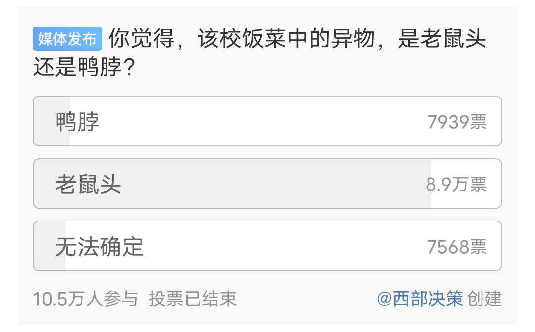 大量網(wǎng)民質(zhì)疑當?shù)叵嚓P(guān)部門“指鼠為鴨”。據(jù)“@西部決策”發(fā)起的一項超10萬人參與的微博投票顯示,近九成網(wǎng)民認為食堂中的異物為“鼠頭”,不少科普博主、微博大V還有媒體均就此事發(fā)表評論,輿論場基調(diào)以追問和批評為主。6月6日上午,微博話題“#長牙的鴨脖令人如鯁在喉#”沖上熱搜榜第一位。另據(jù)《河南商報》報道,有網(wǎng)民爆料該校一教職工疑似要求學(xué)生針對此事進行“控評”。輿論場上,除了批評校方說謊、隱瞞等聲音之外,還有網(wǎng)民疑惑市場監(jiān)管部門為何替學(xué)?!罢九_”,猜測背后存在利益輸送等問題;也有網(wǎng)民拍攝視頻解釋稱,鴨脖在某個角度看起來很像老鼠頭;更多網(wǎng)民呼吁當?shù)乇O(jiān)管部門拿出更多檢測證據(jù)來。
