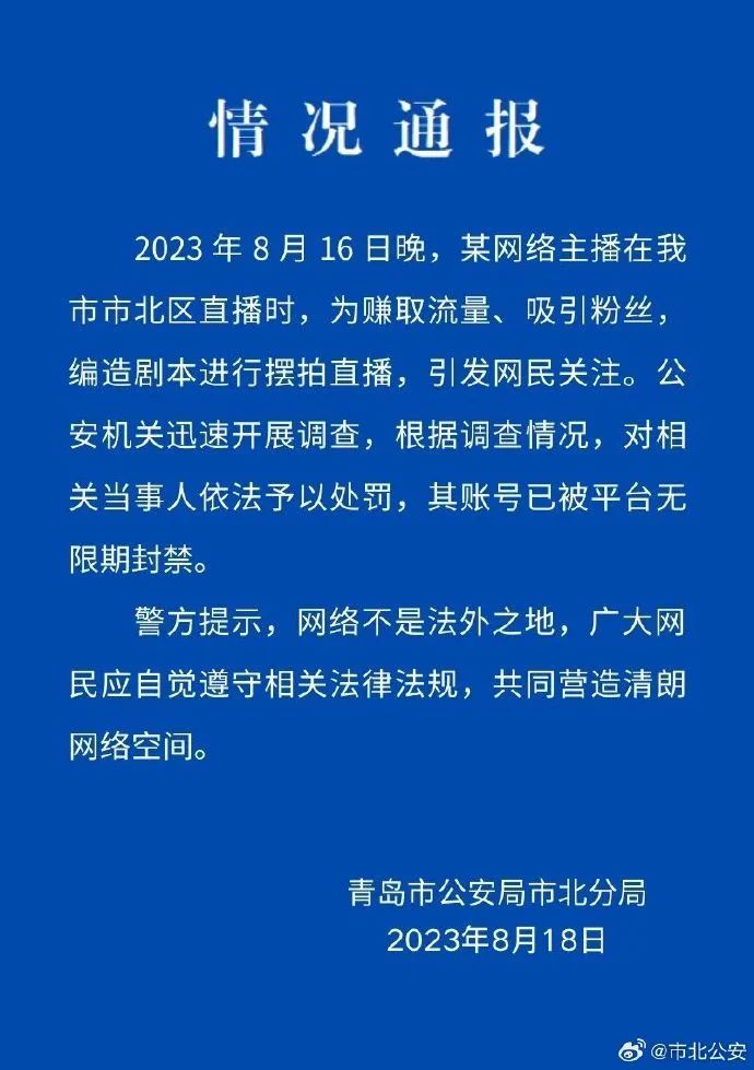 8月18日,青島市公安局市北分局微博賬號“@市北公安”通報稱,某網(wǎng)絡(luò)主播在青島市市北區(qū)直播時,為賺取流量、吸引粉絲,編造劇本進行擺拍直播。公安機關(guān)對相關(guān)當(dāng)事人依法予以處罰,其賬號已被平臺無限期封禁?!?二驢#”“#警方通報網(wǎng)傳二驢直播被綁架#”等多個話題閱讀量近6.7億。輿論對此結(jié)果表示認(rèn)同,評論稱“山東警方果斷調(diào)查處置,結(jié)果大快人心”。