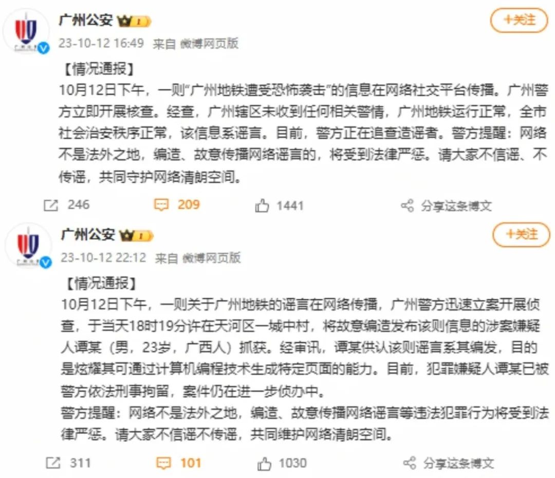 【典型案例】10月12日下午,一則“廣州地鐵遭受恐怖襲擊”的信息在網絡社交平臺傳播。此則消息以截圖的形式被傳播,圖片顯示作者為“廣州市公安局”,內容稱“10月12日下午14時,廣州市地鐵3號線珠江新城站,3名恐怖分子攜帶TNT炸藥在地鐵搶劫,走火發(fā)生意外,產生劇烈爆炸,造成多方傷亡”。當日16時49分,官方微博“@廣州公安”發(fā)布通報進行辟謠。同日22時12分,“@廣州公安”再次發(fā)布通報稱,當天18時19分許在天河區(qū)一城中村,警方將故意編造發(fā)布該則信息的涉案嫌疑人譚某抓獲。經審訊,譚某供認該則謠言系其編發(fā),目的是炫耀其可通過計算機編程技術生成特定頁面的能力。