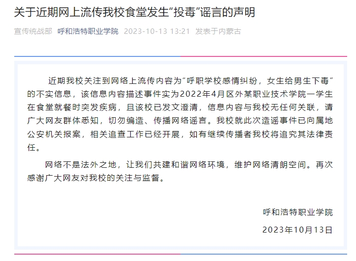 【典型案例】自10月初,連續(xù)有網民在社交媒體發(fā)視頻稱,呼和浩特職業(yè)學院發(fā)生悲劇,一名男生因感情糾紛被女生下毒致死,引發(fā)社會關注。10月13日,該校發(fā)布了一份聲明,澄清這條信息不實,與學校無任何關聯(lián)。據(jù)悉,網絡流傳的視頻中描述的事件實為2022年4月江蘇南京交通職業(yè)技術學院一學生在食堂就餐時突發(fā)疾病 ,并非因為女生下毒。而且,江蘇南京交通職業(yè)技術學院在當時就已經發(fā)布了相關澄清。再如,10月18日,網傳江蘇南京有男子在酒吧外性侵一名醉酒女子。當日,事發(fā)地所屬南京市警方相關工作人員回應稱,警方已查清此事,沒有性侵,網傳情況有夸大成分。另據(jù)警方透露,某社交網站流傳的不實消息,“是專門的AI軟件寫的”。