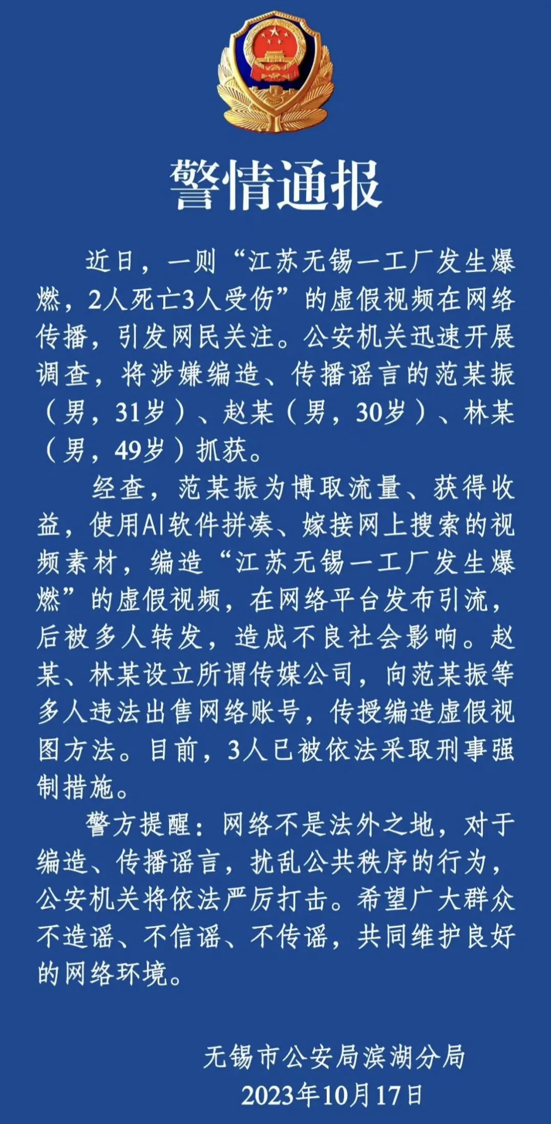【典型案例】10月17日,一則“江蘇無錫一工廠發(fā)生爆燃,2人死亡3人受傷”的虛假視頻在網絡傳播,引發(fā)網民關注。當日20時許,無錫市公安局濱湖分局微信公眾號“濱湖警事”發(fā)布警情通報,稱此為一起謠言事件,已經將造謠、傳謠的范某、趙某、林某三人抓獲。經查,范某為博取流量、獲得收益,使用AI軟件拼湊、嫁接網上搜索的視頻素材,編造相關虛假視頻,在網絡平臺發(fā)布引流,后被多人轉發(fā),造成不良社會影響。趙某、林某設立所謂傳媒公司,向范某等多人違法出售網絡賬號,傳授編造虛假視圖方法。