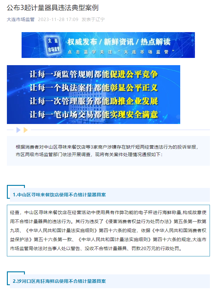 11月11日,大連市市場(chǎng)監(jiān)管局再發(fā)通報(bào)稱,聯(lián)合公安機(jī)關(guān)另查處3起非法改裝銷售計(jì)量器具案,相關(guān)案件均在調(diào)查中。12日,大連市市場(chǎng)監(jiān)管局又通報(bào)稱,中山區(qū)尋味來餐飲店在經(jīng)營(yíng)中使用的電子計(jì)價(jià)秤經(jīng)無錫市計(jì)量測(cè)試院檢測(cè),檢定結(jié)論為不合格。14日,“B太”成功破解“鬼秤”再登上熱搜。據(jù)“B太”視頻,中山區(qū)尋味來餐廳使用的“鬼秤”輸入“作弊碼”,便可調(diào)節(jié)六個(gè)擋位。光明網(wǎng)、《工人日?qǐng)?bào)》等主流媒體評(píng)論稱,整治“鬼秤”是維護(hù)消費(fèi)者合法權(quán)益的必須之舉,不能總在曝光后才“迅速行動(dòng)”“嚴(yán)厲查處”,建立健全常態(tài)化長(zhǎng)效化的監(jiān)管機(jī)制才是治本之策。部分網(wǎng)民質(zhì)疑市場(chǎng)監(jiān)管部門日常監(jiān)管疏忽、通報(bào)不痛不癢,并對(duì)后續(xù)處罰結(jié)果表示關(guān)注。