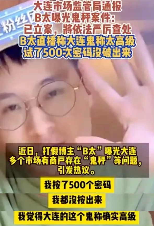 11月9日,“B太”發(fā)布實(shí)測(cè)海鮮加工餐廳的視頻,稱其到訪的3家海鮮加工商家均疑似在秤上做了手腳?!癇太”嘗試破解商家使用的“鬼秤”密碼時(shí),被商家推搡,還遭威脅“把眼鏡給你砸了”;其撥打市場(chǎng)監(jiān)管局電話后,等待一個(gè)半小時(shí)仍無人到場(chǎng),直到“B太”開啟直播,工作人員才姍姍來遲?!癇太”出示相關(guān)視頻證據(jù),經(jīng)檢查該商家的電子秤雖然有強(qiáng)檢合格證,但沒有鉛封。而當(dāng)“鬼秤”被帶到市場(chǎng)監(jiān)管局時(shí),專業(yè)檢測(cè)人員只對(duì)“問題電子秤”進(jìn)行簡(jiǎn)單檢測(cè)后就宣布該秤“無問題”。當(dāng)“B太”提出對(duì)電子秤進(jìn)行密碼破譯時(shí),檢測(cè)人員表示“我也跟著學(xué)習(xí)學(xué)習(xí)”,但“B太”嘗試了500多個(gè)密碼都未破解成功。次日,該電子秤被送往無錫檢測(cè)?!癇太”在微博和抖音平臺(tái)發(fā)布相關(guān)視頻,播放量迅速破億次,多數(shù)網(wǎng)民指責(zé)店家有恃無恐,質(zhì)疑市場(chǎng)監(jiān)管部門消極怠工;部分計(jì)劃去大連旅游的網(wǎng)民還表示,因擔(dān)心被“坑”將臨時(shí)改變目的地。