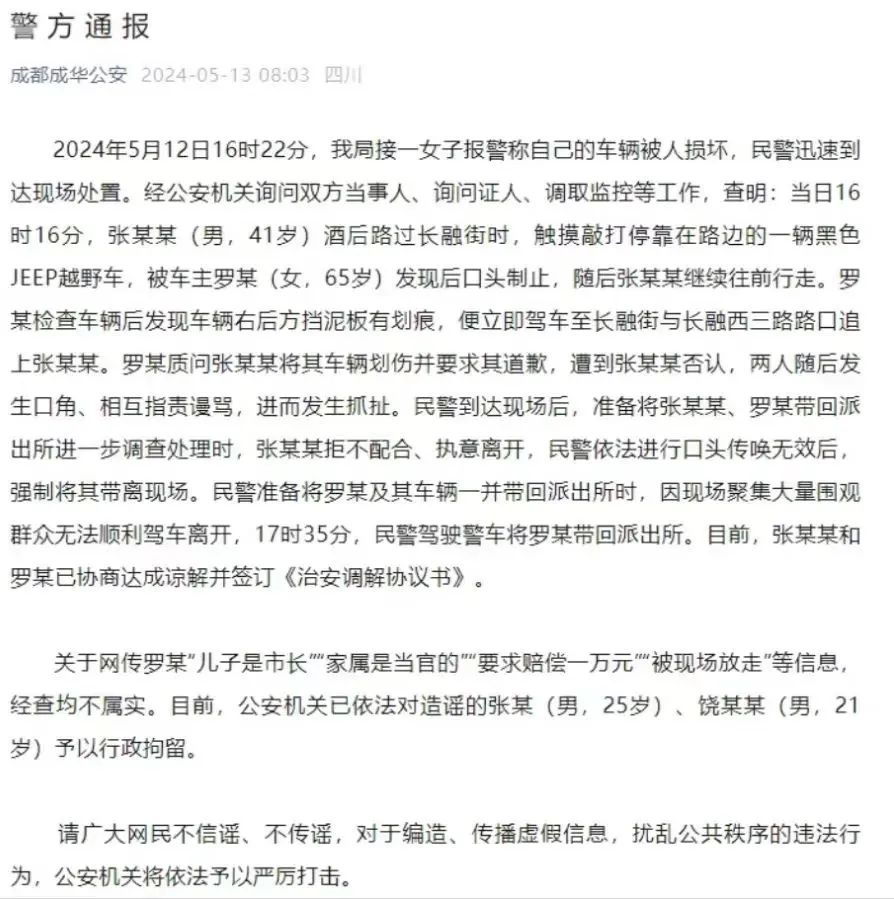 5月13日8時(shí)許,成都市成華區(qū)警方發(fā)布通報(bào)介紹事發(fā)過程,稱5月12日16時(shí)許,張某某(男,41歲)酒后觸摸敲打??吭诼愤叺牧_某(女,65歲)的車,雙方發(fā)生口角抓扯。張某某拒不配合、執(zhí)意離開,民警依法進(jìn)行口頭傳喚無效后,強(qiáng)制將其帶離現(xiàn)場。民警準(zhǔn)備將羅某及其車輛一并帶回派出所時(shí),因現(xiàn)場聚集大量圍觀群眾無法順利駕車離開。目前,雙方已協(xié)商達(dá)成諒解并簽訂調(diào)解書,網(wǎng)傳羅某“要求賠償一萬元”“被現(xiàn)場放走”等信息均不屬實(shí),公安機(jī)關(guān)已依法對造謠的張某和饒某某予以行政拘留。該通報(bào)被光明網(wǎng)、“@四川日報(bào)”等媒體轉(zhuǎn)發(fā)后帶動(dòng)輿情升溫,“#警方通報(bào)男子摸車被索賠1萬#”等熱搜話題閱讀量累積近8000萬次。部分網(wǎng)民調(diào)侃車主“神通廣大”,吐槽“以后停在路邊的車別亂摸”;有網(wǎng)民對通報(bào)內(nèi)容表示懷疑,追問為何“把吉普車圍起來”等,還有網(wǎng)民呼吁公開現(xiàn)場監(jiān)控?!癅作家劉小海”“@無心簡影”等大V則力挺成都警方,反問“成都市長快60的人了,怎么可能有個(gè)65歲的媽”“難道不是因?yàn)楝F(xiàn)場有人煽動(dòng)造成人員聚集,怕現(xiàn)場失控才來了這么多警察嗎”。