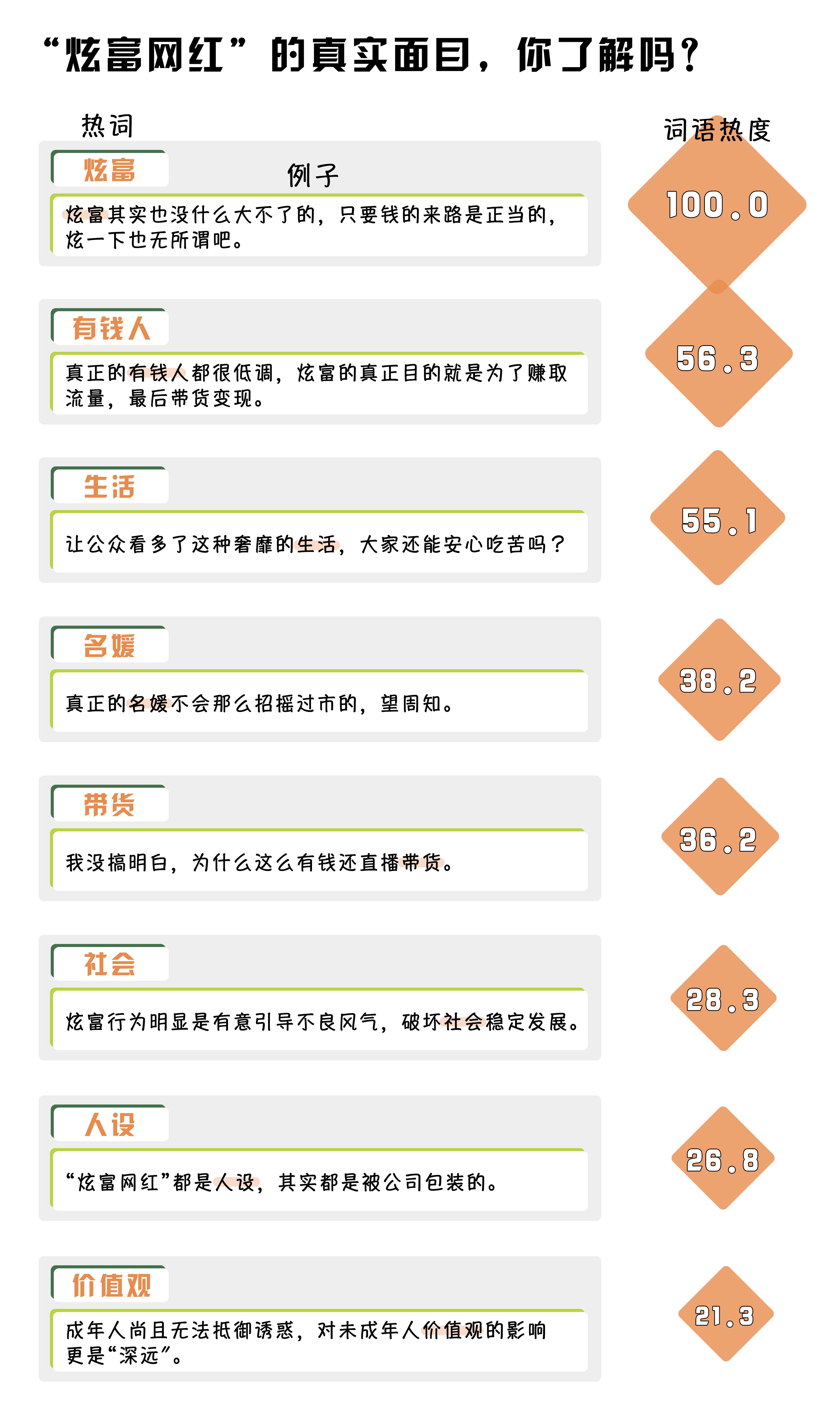 (制作:法治網(wǎng)輿情中心 數(shù)據(jù)來源:在嗶哩嗶哩選取《炫富網(wǎng)紅圈“地震”:多名百萬級網(wǎng)紅被全平臺封禁》《“京城第一名媛”被全網(wǎng)封殺》等兩則視頻的彈幕、一級評論,進行數(shù)據(jù)清洗及自然語言處理,將熱度最高的詞語規(guī)定為100)