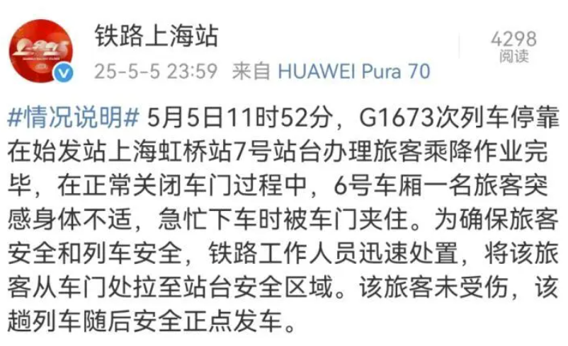 5月5日,網(wǎng)傳上海虹橋高鐵站又現(xiàn)“女子阻礙高鐵關(guān)門”事件。視頻顯示,有目擊者稱,女子此舉是為了等后面的老太太。當(dāng)日深夜,“@鐵路上海站”通報(bào)稱,當(dāng)事旅客因突感身體不適,急忙下車時(shí)被門夾住,工作人員迅速將其拉至安全區(qū)域。該旅客未受傷,該趟列車隨后安全正點(diǎn)發(fā)車。通報(bào)發(fā)出后,多數(shù)網(wǎng)民表示理解,但也有網(wǎng)民并不認(rèn)同上海鐵路方的處理方式,認(rèn)為如果以后都可以用這些理由,會(huì)引發(fā)更多人效仿。